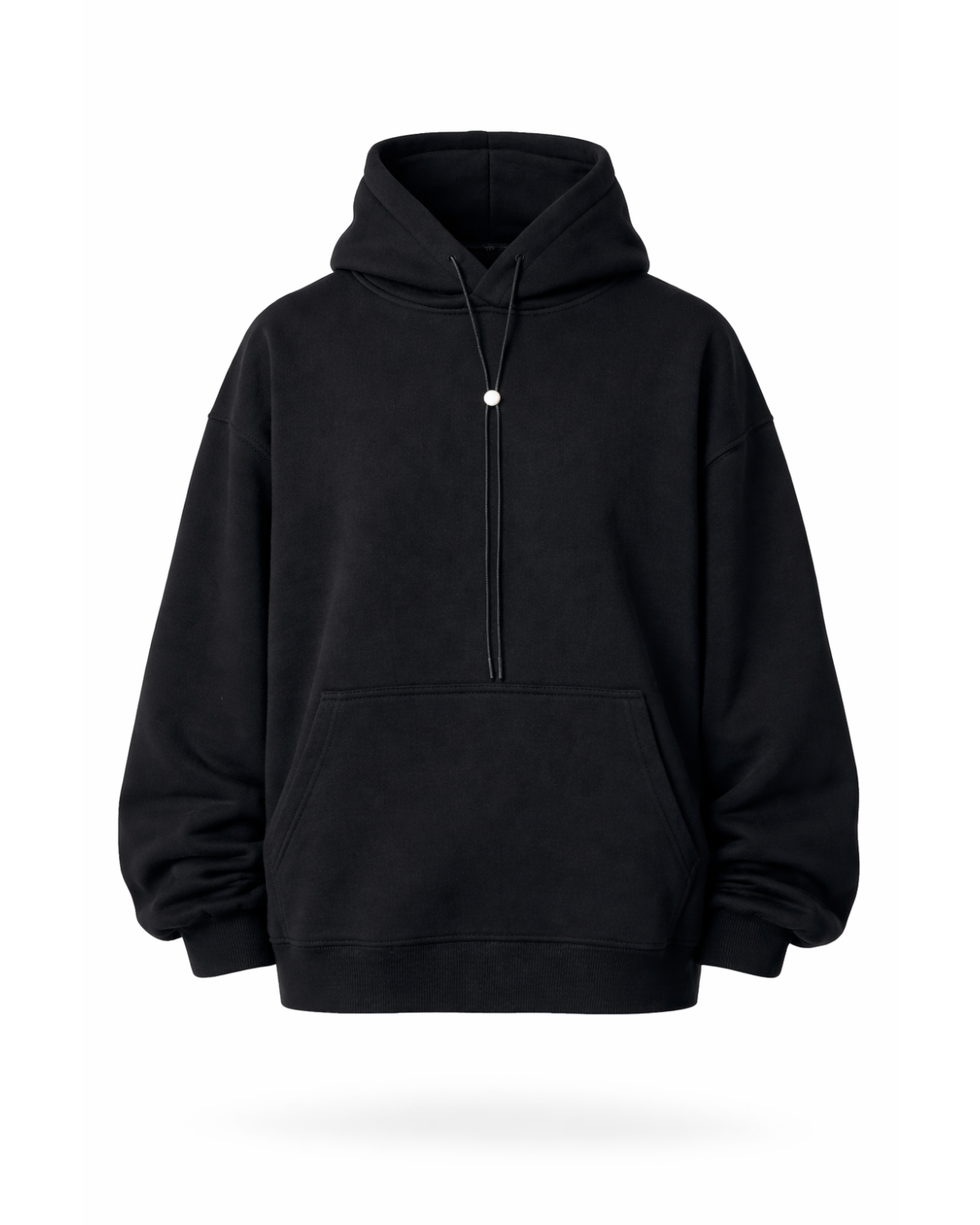 Derin siyah pamuk fleece yüzey yapısı yoğunluk dengesi sağlayarak tekrarlı yıkama testlerinde dayanıklılığı artırır ve planlı private label hoodie üretimi süreçlerinde güvenilir performans sağlar.